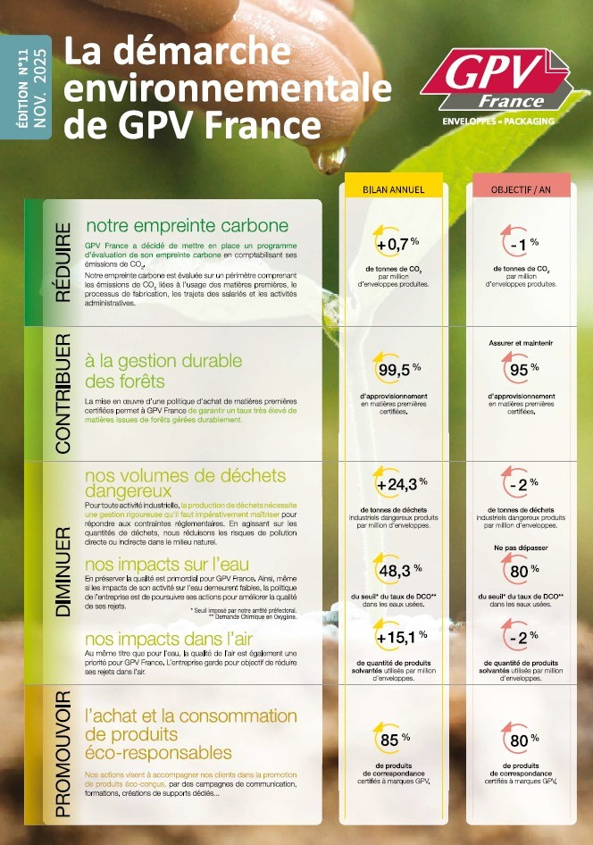 En outre, GPV France contribue à CITEO (Ecofolio et Eco-emballages) qui encourage le tri et le recyclage et réduit l'impact environnemental des papiers et des emballages.